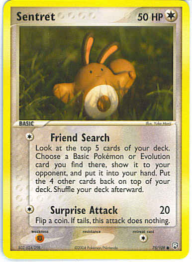 | Type | Colorless | | Pokemon serie | Team Rocket Returns | | Stadie | Basic | | HP | 50 | | Sjældenhed | Common | | Tilbagetrækning | 1 | | Svaghed | F | | Kortnummer | 75 | | Evne | [C] Friend Search - Look at the top 5 cards of your deck. Choose a Basic Pokemon or Evolution card you find there, show it to your opponent, and put it into your hand. Put the 4 other cards back on top of your deck. Shuffle your deck afterward. [C] Surprise Attack (20) Flip a coin. If tails, this attack does nothing. | | Evne2 | [C] Friend Search - Look at the top 5 cards of your deck. Choose a Basic Pokemon or Evolution card you find there, show it to your opponent, and put it into your hand. Put the 4 other cards back on top of your deck. Shuffle your deck afterward. [C] Surprise Attack (20) Flip a coin. If tails, this attack does nothing. | | Kunstner | Yuka Morii |
