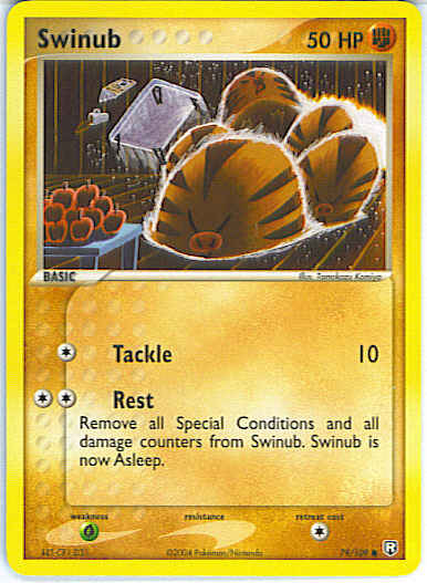 | Type | Fighting | | Pokemon serie | Team Rocket Returns | | Stadie | Basic | | HP | 50 | | Sjældenhed | Common | | Tilbagetrækning | 1 | | Svaghed | G | | Kortnummer | 79 | | Evne | [C] Tackle (10) [CC] Rest - Remove all Special Conditions and all damage counters from Swinub. Swinub is now Asleep. | | Evne2 | [C] Tackle (10) [CC] Rest - Remove all Special Conditions and all damage counters from Swinub. Swinub is now Asleep. | | Kunstner | Tomokazu Komiya |