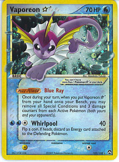 | Type | Water | | Pokemon serie | Power Keepers | | Stadie | Basic | | HP | 70 | | Sjældenhed | Ultra-Rare | | Tilbagetrækning | 1 | | Svaghed | L | | Kortnummer | 102 | | Evne |