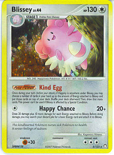 Evne [C] Happy Chance (20+) Does 20 damage plus 10 more damage for each Energy attached to Blissey. Before doing damage, you may search your discard pile for a basic Energy card and attach it to Blissey.