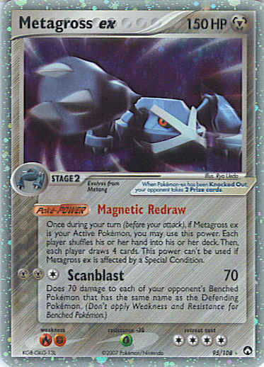 | Type | Metal | | Pokemon serie | Power Keepers | | Stadie | Stage 2 | | HP | 150 | | Sjældenhed | Ultra-Rare | | Tilbagetrækning | 4 | | Modstand | G | | Svaghed | FR | | Kortnummer | 95 | | Evne |
