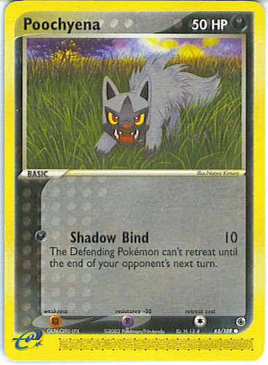 | Type | Darkness | | Pokemon serie | Ruby Sapphire | | Stadie | Basic | | HP | 50 | | Sjældenhed | Common | | Tilbagetrækning | 1 | | Modstand | P | | Svaghed | F | | Kortnummer | 65 | | Evne | [D] Shadow Bind (10) The Defending Pokemon can't retreat until the end of your opponent's next turn.