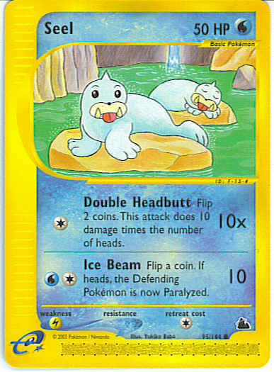 | Type | Water | | Pokemon serie | Skyridge | | Stadie | Basic | | HP | 50 | | Sjældenhed | Common | | Tilbagetrækning | 1 | | Svaghed | L | | Kortnummer | 95 | | Evne | [C] Double Headbutt (10x) Flip 2 coins. This attack does 10 damage times the number of heads. [CW] Ice Beam (10) Flip a coin. If heads, the Defending Pokemon is now Paralyzed.