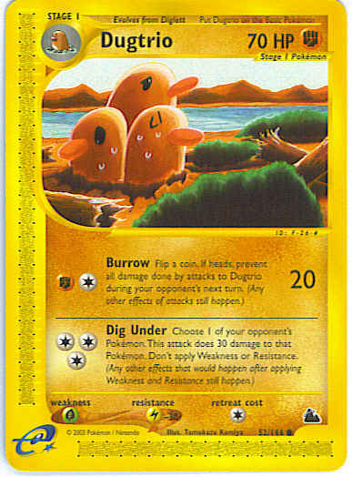 | Type | Fighting | | Pokemon serie | Skyridge | | Stadie | Stage 1 | | HP | 70 | | Sjældenhed | Common | | Tilbagetrækning | 1 | | Modstand | L | | Svaghed | G | | Kortnummer | 52 | | Evne | [CF] Burrow (20) Flip a coin. If heads, prevent all damage done by attacks to Dugtrio during your opponent's next turn. (any other effects of attacks still happen.) [CCC] Dig Under - Choose 1 of your opponent's Pokemon. This attack does 30 damage to that Pokemon. Don't apply Weakness or Resistance. (any other effects that would happen after applying Weakness and Resistance still happen.)