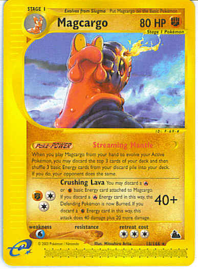 | Type | Fighting | | Pokemon serie | Skyridge | | Stadie | Stage 1 | | HP | 80 | | Sjældenhed | Rare | | Tilbagetrækning | 3 | | Svaghed | W | | Kortnummer | 18 | | Evne | [CCF] Crushing Lava (40+) You may discard a R or F basic Energy card attached to Magcargo. If you discard a R Energy card in this way, the Defending Pokemon is now Burned. If you discard a F Energy card in this way, this attack does 40 damage plus 20 more damage.