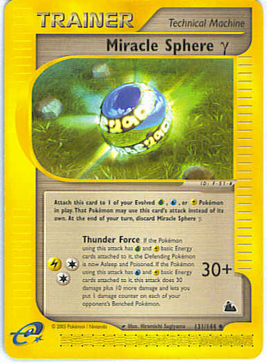 | Type | Trainer | | Pokemon serie | Skyridge | | Stadie | Trainer (Technical Machine) | | Sjældenhed | Uncommon | | Kortnummer | 131 | | Evne | [CCL] Thunderforce (30+) If the Pokemon using this attack has G and L basic Energy cards attached to it, the Defending Pokemon is now Asleep and Poisoned. If the Pokemon using this attack has W and L basic Energy cards attached to it, this attack does 30 damage plus 10 more damage and lets you put 1 damage counter on each of your opponent's Benched Pokemon.