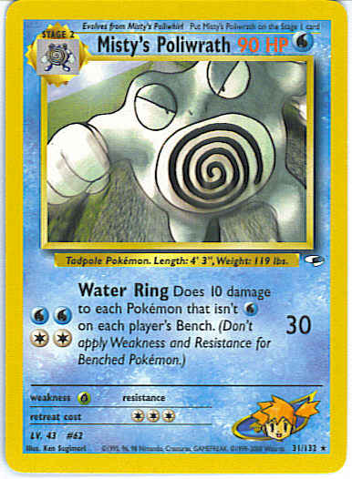 | Type | Water | | Pokemon serie | Gym Heroes | | Stadie | Stage 2 | | HP | 90 | | Sjældenhed | Rare | | Tilbagetrækning | 3 | | Svaghed | G | | Kortnummer | 31 | | Evne |