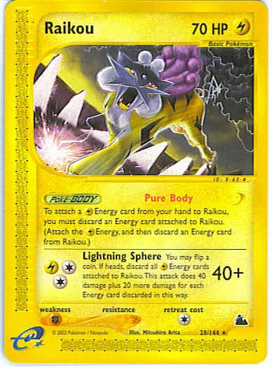| Type | Lightning | | Pokemon serie | Skyridge | | Stadie | Basic | | HP | 70 | | Sjældenhed | Rare | | Tilbagetrækning | 1 | | Svaghed | R | | Kortnummer | 28 | | Evne | [CCL] Lightning Sphere (40+) You may flip a coin. If heads, discard all L Energy cards attached to Raikou. This attack does 40 damage plus 20 more damage for each Energy card discarded in this way.