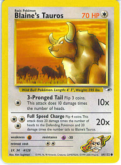 [CCC] Full Speed Charge (20x) Flip 4 coins. This attack does 20 damage times the number of heads to the Defending Pokemon and 20 damage times the number tails to Blaine's Tauros.
