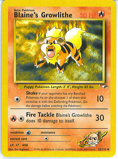 | Type | Fire | | Pokemon serie | Gym Heroes | | Stadie | Basic | | HP | 50 | | Sjældenhed | Uncommon | | Tilbagetrækning | 1 | | Svaghed | W | | Kortnummer | 35 | | Evne |