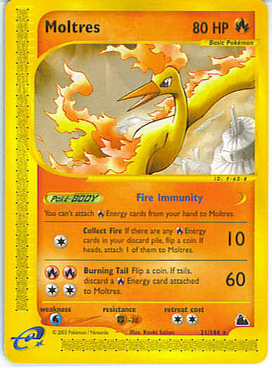 | Type | Fire | | Pokemon serie | Skyridge | | Stadie | Basic | | HP | 80 | | Sjældenhed | Rare | | Tilbagetrækning | 2 | | Modstand | F | | Svaghed | W | | Kortnummer | 21 | | Evne | [C] Collect Fire (10) If there are any R Energy cards in your discard pile, flip a coin. If heads, attach 1 of them to Moltres. [CCRR] Burning Tail (60) Flip a coin. If tails, discard a R Energy card attached to Moltres.
