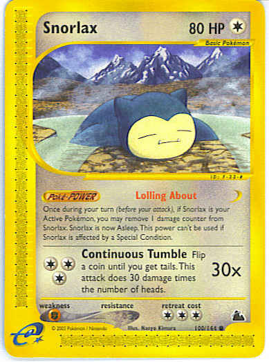 | Type | Colorless | | Pokemon serie | Skyridge | | Stadie | Basic | | HP | 80 | | Sjældenhed | Common | | Tilbagetrækning | 3 | | Svaghed | F | | Kortnummer | 100 | | Evne | [CCC] Continuous Tumble (30x) Flip a coin until you get tails. This attack does 30 damage times the number of heads.