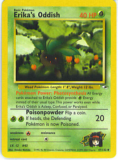 | Type | Grass | | Pokemon serie | Gym Heroes | | Stadie | Basic | | HP | 40 | | Sjældenhed | Uncommon | | Tilbagetrækning | 1 | | Svaghed | R | | Kortnummer | 47 | | Evne |