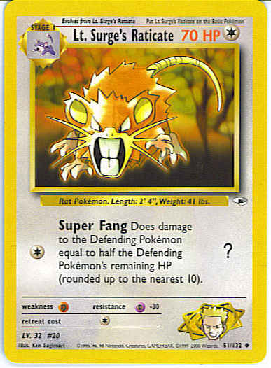 | Type | Colorless | | Pokemon serie | Gym Heroes | | Stadie | Stage 1 | | HP | 70 | | Sjældenhed | Uncommon | | Tilbagetrækning | 1 | | Modstand | P | | Svaghed | F | | Kortnummer | 51 | | Evne |