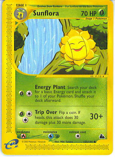 | Type | Grass | | Pokemon serie | Skyridge | | Stadie | Stage 1 | | HP | 70 | | Sjældenhed | Common | | Tilbagetrækning | 1 | | Modstand | W | | Svaghed | R | | Kortnummer | 105 | | Evne | [CG] Energy Plant - Search your deck for a basic Energy card and attach it to 1 of your Pokemon. Shuffle your deck afterward. [CCG] Trip Over (30+) Flip a coin. If heads, this attack does 30 damage plus 30 more damage.