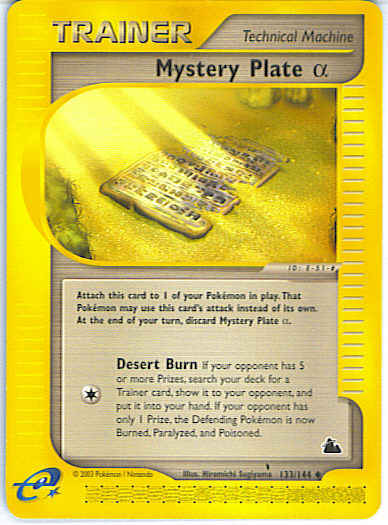 | Type | Trainer | | Pokemon serie | Skyridge | | Stadie | Trainer (Technical Machine) | | Sjældenhed | Uncommon | | Kortnummer | 133 | | Evne | [C] Desert Burn - If your opponent has 5 or more Prizes, search your deck for a Trainer card, show it to your opponent, and put it into your hand. If your opponent has only 1 Prize, the Defending Pokemon is now Burned, Paralyzed, and Poisoned.