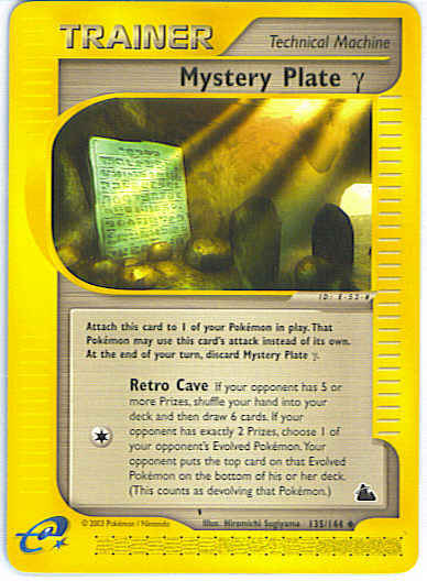 | Type | Trainer | | Pokemon serie | Skyridge | | Stadie | Trainer (Technical Machine) | | Sjældenhed | Uncommon | | Kortnummer | 135 | | Evne | [C] Retro Cave - If your opponent has 5 or more Prizes, shuffle your hand into your deck and then draw 6 cards. If your opponent has exactly 2 Prizes, choose 1 of your opponent's Evolved Pokemon. Your opponent puts the top card on that Evolved Pokemon on the bottom of his or her deck. (This counts as devolving that Pokemon.)