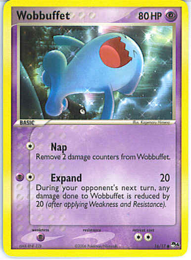 | | Evne2 | [C] Nap - Remove 2 damage counters from Wobbuffet. [CP] Expand (20) During your opponent's next turn, any damage done to Wobbuffet is reduced by 20 (after applying Weakness and Resistance).