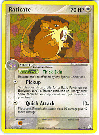| Type | Colorless | | Pokemon serie | Fire Red Leaf Green | | Stadie | Stage 1 | | HP | 70 | | Sjældenhed | Uncommon | | Svaghed | F | | Kortnummer | 48 | | Evne | [C] Pickup - Search your discard pile for a Basic Pokemon (or Evolution card), a Trainer card, and an Energy card. Show them to your opponent and put them into your hand. [C] Quick Attack (10+) Flip a coin. If heads, this attack does 10 damage plus 40 more damage. | | Evne2 | [C] Pickup - Search your discard pile for a Basic Pokemon (or Evolution card), a Trainer card, and an Energy card. Show them to your opponent and put them into your hand. [C] Quick Attack (10+) Flip a coin. If heads, this attack does 10 damage plus 40 more damage. | | Kunstner | Kyoko Umemoto |