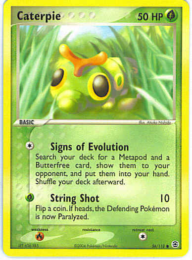 | Type | Grass | | Pokemon serie | Fire Red Leaf Green | | Stadie | Basic | | HP | 50 | | Sjældenhed | Common | | Tilbagetrækning | 1 | | Svaghed | R | | Kortnummer | 56 | | Evne | [C] Signs of Evolution - Search your deck for a Metapod and a Butterfree card, show them to your opponent, and put them into your hand. Shuffle your deck afterward. [G] String Shot (10) Flip a coin. If heads, the Defending Pokemon is now Paralyzed. | | Evne2 | [C] Signs of Evolution - Search your deck for a Metapod and a Butterfree card, show them to your opponent, and put them into your hand. Shuffle your deck afterward. [G] String Shot (10) Flip a coin. If heads, the Defending Pokemon is now Paralyzed. | | Kunstner | Atsuko Nishida |