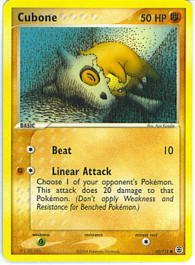 | Type | Fighting | | Pokemon serie | Fire Red Leaf Green | | Stadie | Basic | | HP | 50 | | Sjældenhed | Common | | Tilbagetrækning | 1 | | Svaghed | G | | Kortnummer | 60 | | Evne | [C] Beat (10) [CF] Linear Attack - Choose 1 of your opponent's Pokemon. This attack does 20 damage to that Pokemon. (Don't apply Weakness and Resistance for Benched Pokemon.) | | Evne2 | [C] Beat (10) [CF] Linear Attack - Choose 1 of your opponent's Pokemon. This attack does 20 damage to that Pokemon. (Don't apply Weakness and Resistance for Benched Pokemon.) | | Kunstner | Aya Kusube |