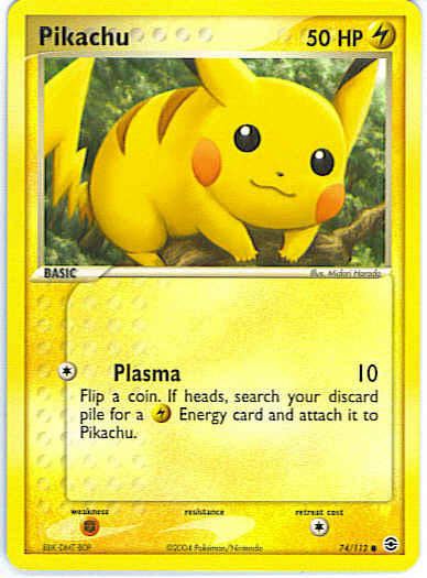 | Type | Lightning | | Pokemon serie | Fire Red Leaf Green | | Stadie | Basic | | HP | 50 | | Sjældenhed | Common | | Tilbagetrækning | 1 | | Svaghed | F | | Kortnummer | 74 | | Evne | [C] Plasma (10) Flip a coin. If heads, search your discard pile for a L Energy card and attach it to Pikachu. | | Evne2 | [C] Plasma (10) Flip a coin. If heads, search your discard pile for a L Energy card and attach it to Pikachu. | | Kunstner | Midori Harada |