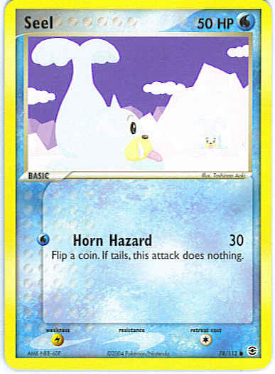| Type | Water | | Pokemon serie | Fire Red Leaf Green | | Stadie | Basic | | HP | 50 | | Sjældenhed | Common | | Tilbagetrækning | 1 | | Svaghed | L | | Kortnummer | 78 | | Evne | [W] Horn Hazard (30) Flip a coin. If tails, this attack does nothing. | | Evne2 | [W] Horn Hazard (30) Flip a coin. If tails, this attack does nothing. | | Kunstner | Toshinao Aoki |