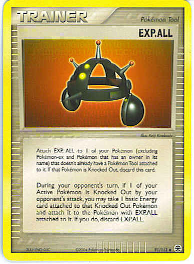 During your opponent's turn, if 1 of your Active Pokemon is Knocked Out by your opponent's attack, you may take 1 basic Energy card attached to that Knocked Out Pokemon and attach it to the Pokemon with EXP.ALL attached to it. If you do, discard EXP.ALL.