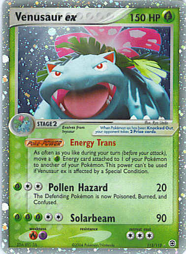 | Type | Grass | | Pokemon serie | Fire Red Leaf Green | | Stadie | Stage 2 | | HP | 150 | | Sjældenhed | Ultra-Rare | | Tilbagetrækning | 3 | | Svaghed | PR | | Kortnummer | 112 | | Evne | [CCG] Pollen Hazard (20) The Defending Pokemon is now Poisoned, Burned, and Confused. [CCGGG] Solarbeam (90) | | Evne2 | [CCG] Pollen Hazard (20) The Defending Pokemon is now Poisoned, Burned, and Confused. [CCGGG] Solarbeam (90) | | Kunstner | Ryo Ueda |