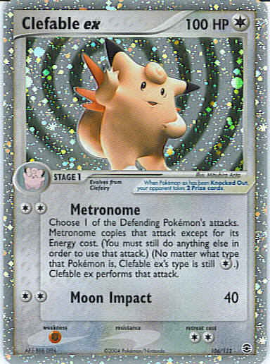 | Type | Colorless | | Pokemon serie | Fire Red Leaf Green | | Stadie | Stage 1 | | HP | 100 | | Sjældenhed | Ultra-Rare | | Tilbagetrækning | 2 | | Svaghed | F | | Kortnummer | 106 | | Evne | [CC] Metronome - Choose 1 of the Defending Pokemon's attacks. Metronome copies that attack except for its Energy cost. (You must still do anything else in order to use that attack.) (No matter what type that Pokemon is, Clefable ex's type is still Colorless.) Clefable ex performs that attack. [CC] Moon Impact (40) | | Evne2 | [CC] Metronome - Choose 1 of the Defending Pokemon's attacks. Metronome copies that attack except for its Energy cost. (You must still do anything else in order to use that attack.) (No matter what type that Pokemon is, Clefable ex's type is still Colorless.) Clefable ex performs that attack. [CC] Moon Impact (40) | | Kunstner | Mitsuhiro Arita |