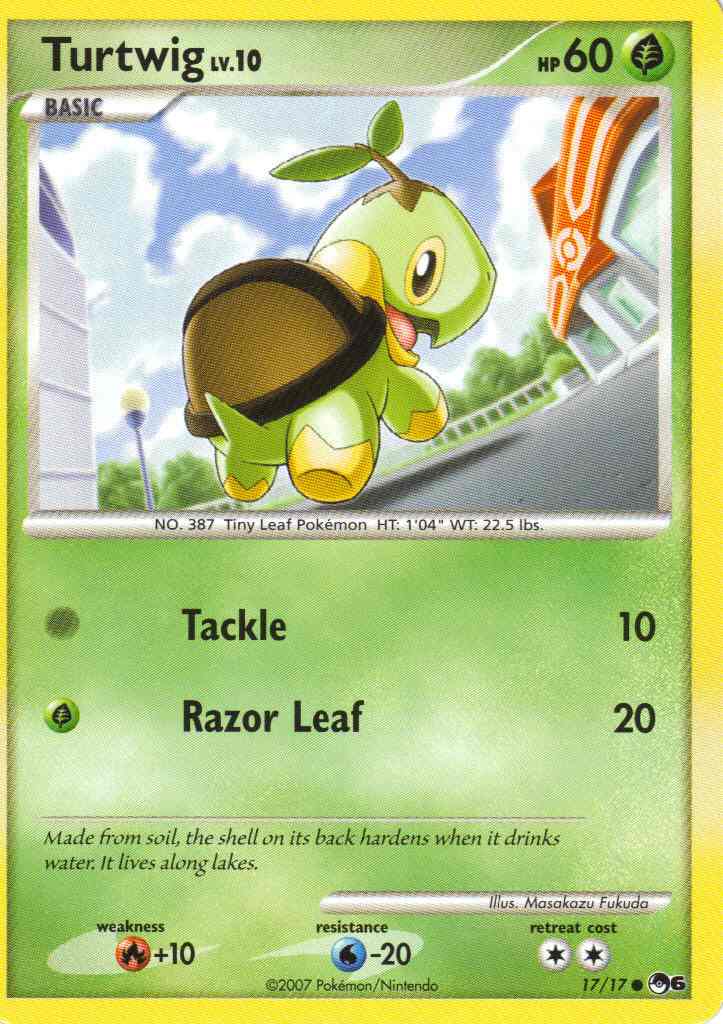 | Type | Grass | | Pokemon serie | OP Series 6 | | Stadie | Basic | | HP | 60 | | Sjældenhed | Common | | Tilbagetrækning | 2 | | Modstand | W-20 | | Svaghed | R+10 | | Kortnummer | 17 | | Evne |