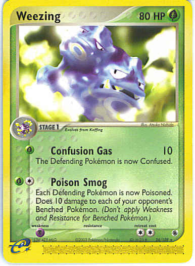 | | Evne2 | [G] Confusion Gas (10) The Defending Pokemon is now Confused. [CG] Poison Smog - Each Defending Pokemon is now Poisoned. Does 10 damage to each of your opponent's Benched Pokemon. (Don't apply Weakness and Resistance for Benched Pokemon.)
