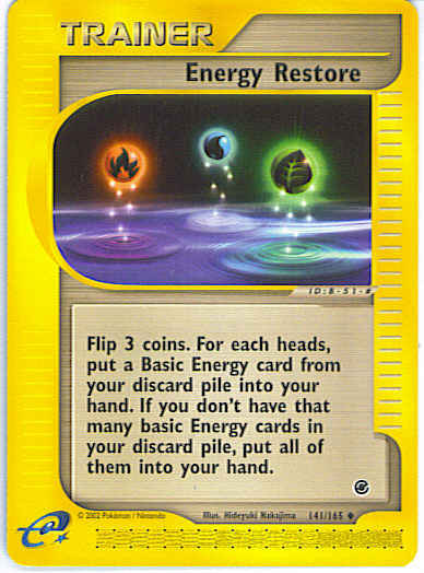 Flip 3 coins. For each heads, put a basic Energy card from your discard pile into your hand. If you don't have that many basic Energy cards in your discard pile, put all of them into your hand.