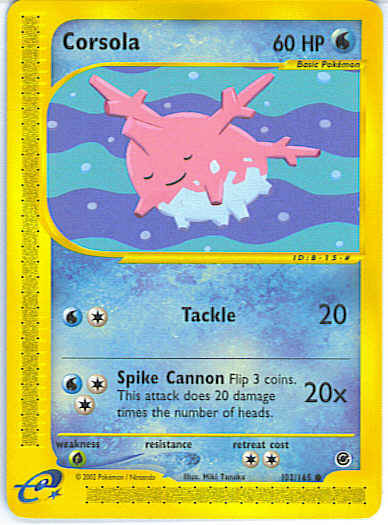 | Type | Water | | Pokemon serie | Expedition | | Stadie | Basic | | HP | 60 | | Sjældenhed | Common | | Tilbagetrækning | 2 | | Svaghed | G | | Kortnummer | 102 | | Evne |