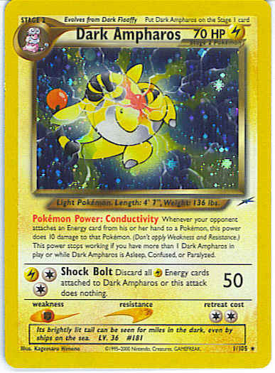 | Type | Lightning | | Pokemon serie | Neo Destiny | | Stadie | Stage 2 | | HP | 70 | | Sjældenhed | Rare | | Tilbagetrækning | 2 | | Svaghed | F | | Kortnummer | 1 | | Evne |