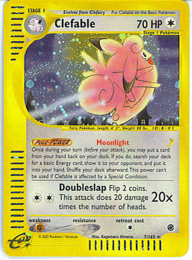 | Type | Colorless | | Pokemon serie | Expedition | | Stadie | Stage 1 | | HP | 70 | | Sjældenhed | Rare | | Tilbagetrækning | 1 | | Svaghed | F | | Kortnummer | 7 | | Evne |