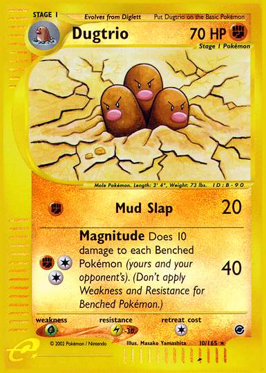 | Type | Fighting | | Pokemon serie | Expedition | | Stadie | Stage 1 | | HP | 70 | | Sjældenhed | Rare | | Tilbagetrækning | 1 | | Modstand | L | | Svaghed | G | | Kortnummer | 10 | | Evne |