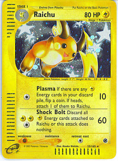 | Type | Lightning | | Pokemon serie | Expedition | | Stadie | Stage 1 | | HP | 80 | | Sjældenhed | Rare | | Tilbagetrækning | 1 | | Svaghed | F | | Kortnummer | 25 | | Evne |