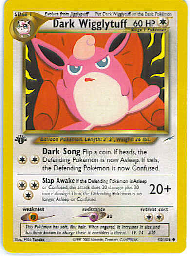 | Type | Colorless | | Pokemon serie | Neo Destiny | | Stadie | Stage 1 | | HP | 60 | | Sjældenhed | Uncommon | | Tilbagetrækning | 2 | | Modstand | P | | Svaghed | F | | Kortnummer | 40 | | Evne |