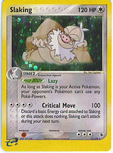 | Type | Colorless | | Pokemon serie | Ruby Sapphire | | Stadie | Stage 2 | | HP | 120 | | Sjældenhed | Rare | | Tilbagetrækning | 3 | | Svaghed | F | | Kortnummer | 12 | | Evne | [CCCC] Critical Move (100) Discard a Basic Energy card attached to Slaking or this attack does nothing. Slaking can't attack during your next turn.