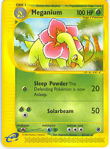 | Type | Grass | | Pokemon serie | Expedition | | Stadie | Stage 2 | | HP | 100 | | Sjældenhed | Rare | | Tilbagetrækning | 3 | | Modstand | W | | Svaghed | R | | Kortnummer | 53 | | Evne |