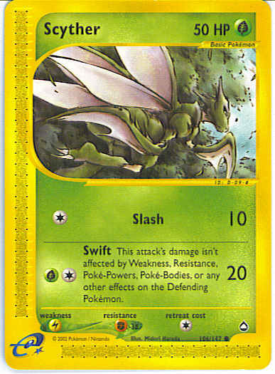 | Type | Grass | | Pokemon serie | Aquapolis | | Stadie | Basic | | HP | 50 | | Sjældenhed | Common | | Tilbagetrækning | 1 | | Modstand | F | | Svaghed | L | | Kortnummer | 106 | | Evne | [C] Slash (10) [CG] Swift (20) This attack's damage isn't affected by Weakness, Resistance, Poke-Powers, Poke-Bodies, or any other effects on the Defending Pokemon.