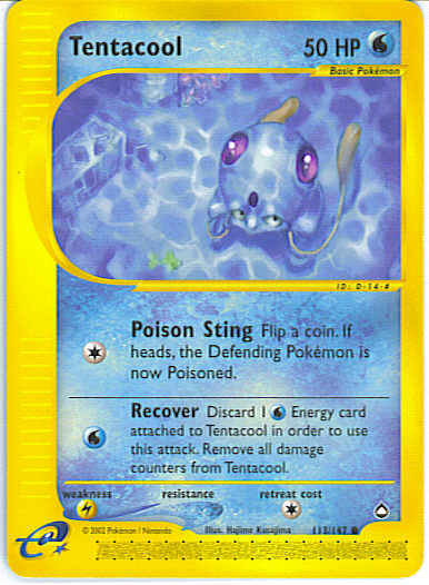 | Type | Water | | Pokemon serie | Aquapolis | | Stadie | Basic | | HP | 50 | | Sjældenhed | Common | | Tilbagetrækning | 1 | | Svaghed | L | | Kortnummer | 113 | | Evne | [C] Poison Sting - Flip a coin. If heads, the Defending Pokemon is now Poisoned. [W] Recover - Discard 1 W Energy card attached to Tentacool. Remove all damage counters from Tentacool.