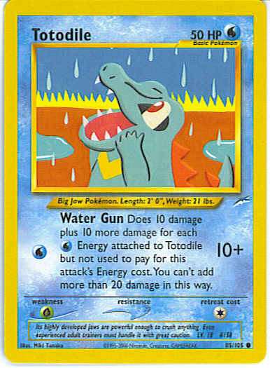 [W] Water Gun (10+) Does 10 damage plus 10 more damage for each W Energy attached to Totodile but not used to pay for this attack's Energy cost. You can't add more than 20 damage in this way.