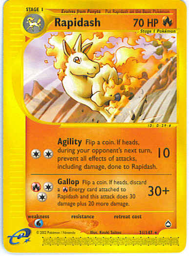 | Type | Fire | | Pokemon serie | Aquapolis | | Stadie | Stage 1 | | HP | 70 | | Sjældenhed | Rare | | Svaghed | W | | Kortnummer | 31 | | Evne | [CC] Agility (10) Flip a coin. If heads, prevent all effects of attacks, including damage, done to Rapidash during your opponent's next turn. [CCR] Gallop (30+) Flip a coin. If heads, this attack does 30 damage plus 20 more damage and you discard 1 R Energy card attached to Rapidash.