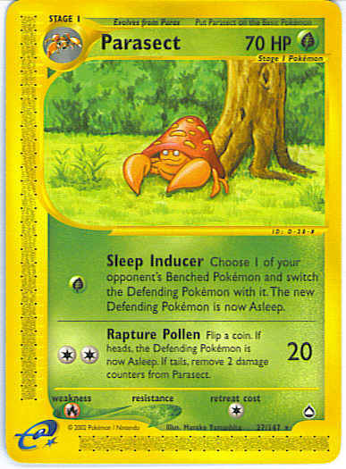 | Type | Grass | | Pokemon serie | Aquapolis | | Stadie | Stage 1 | | HP | 70 | | Sjældenhed | Rare | | Tilbagetrækning | 1 | | Svaghed | R | | Kortnummer | 27 | | Evne | [G] Sleep Inducer - If your opponent has any Benched Pokemon, choose 1 of them and switch it with the Defending Pokemon. The new Defending Pokemon is now Asleep. [CC] Rupture Pollen (20) Flip a coin. If heads, the Defending Pokemon is now Asleep. If tails, remove 2 damage counters from Parasect.