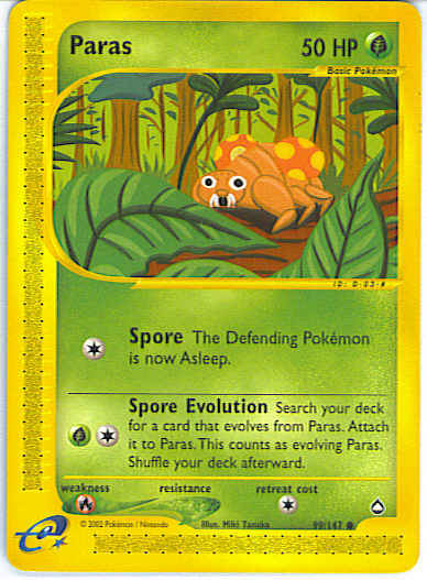 | Type | Grass | | Pokemon serie | Aquapolis | | Stadie | Basic | | HP | 50 | | Sjældenhed | Common | | Tilbagetrækning | 1 | | Svaghed | R | | Kortnummer | 99 | | Evne | [C] Spore - The Defending Pokemon is now Asleep. [CG] Spore Evolution - Search your deck for a card that evolves from Paras and put that card on Paras. (This counts as evolving Paras.) Shuffle your deck afterward.
