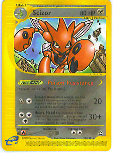 | Type | Metal | | Pokemon serie | Aquapolis | | Stadie | Stage 1 | | HP | 80 | | Sjældenhed | Rare | | Tilbagetrækning | 2 | | Svaghed | R | | Kortnummer | 32 | | Evne | [CM] Snatch (20) Before doing damage, if your opponent has any Benched Pokemon with no damage counters on it, you may choose 1 of them and switch it with the Defending Pokemon. [CCC] Heavy Metal (30+) Flip a number of coins equal to the number of Metal Energy attached to Scizor. This attack does 30 damage plus 20 damage times the number of heads.