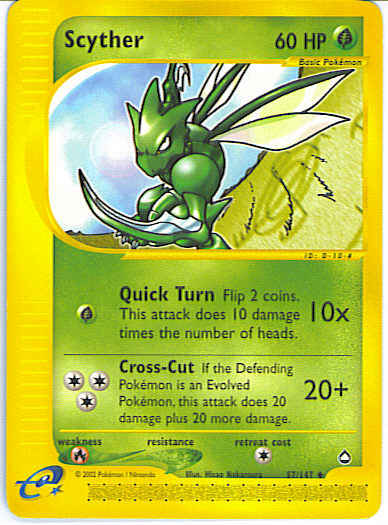| Type | Grass | | Pokemon serie | Aquapolis | | Stadie | Basic | | HP | 60 | | Sjældenhed | Uncommon | | Tilbagetrækning | 1 | | Svaghed | R | | Kortnummer | 57 | | Evne | [G] Quick Turn (10x) Flip 2 coins. This attack does 10 damage times the number of heads. [CCC] Cross-Cut (20+) If the Defending Pokemon is an Evolved Pokemon, this attack does 20 damage plus 20 more damage.