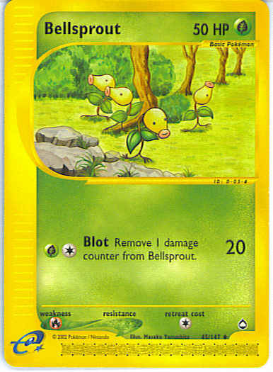 | Type | Grass | | Pokemon serie | Aquapolis | | Stadie | Basic | | HP | 50 | | Sjældenhed | Uncommon | | Tilbagetrækning | 1 | | Svaghed | R | | Kortnummer | 45 | | Evne | [CG] Blot (20) Remove 1 damage counter from Bellsprout, if any.